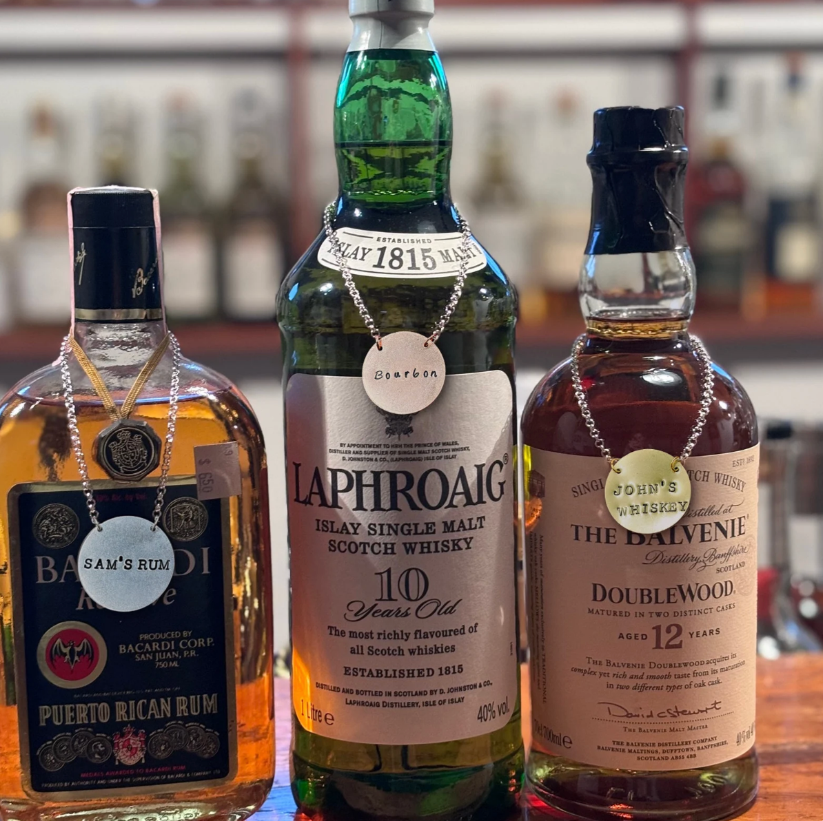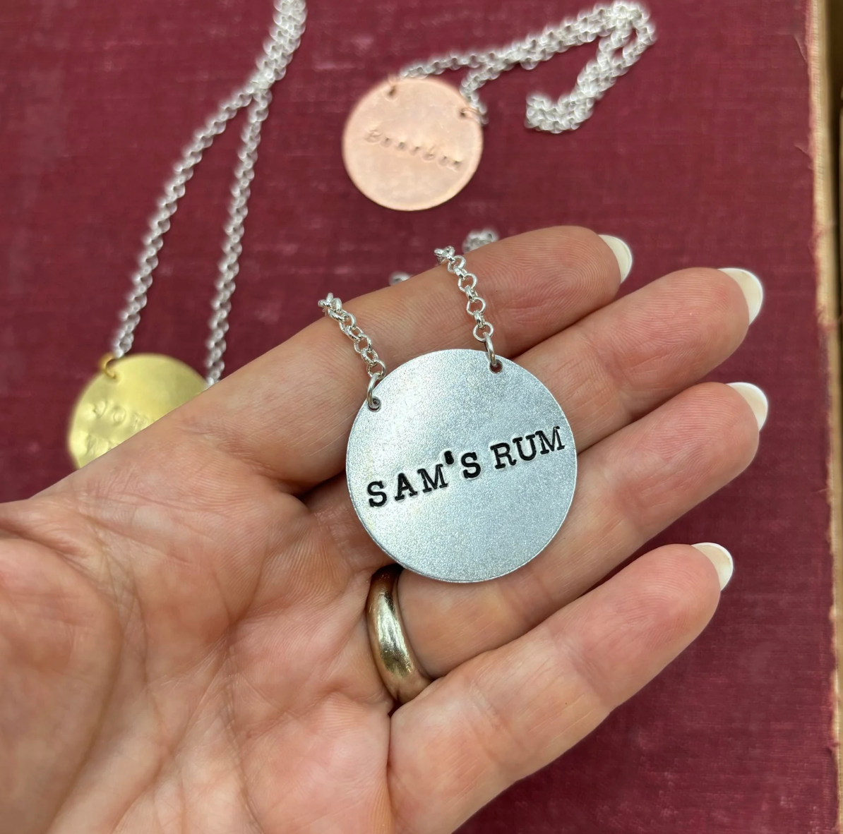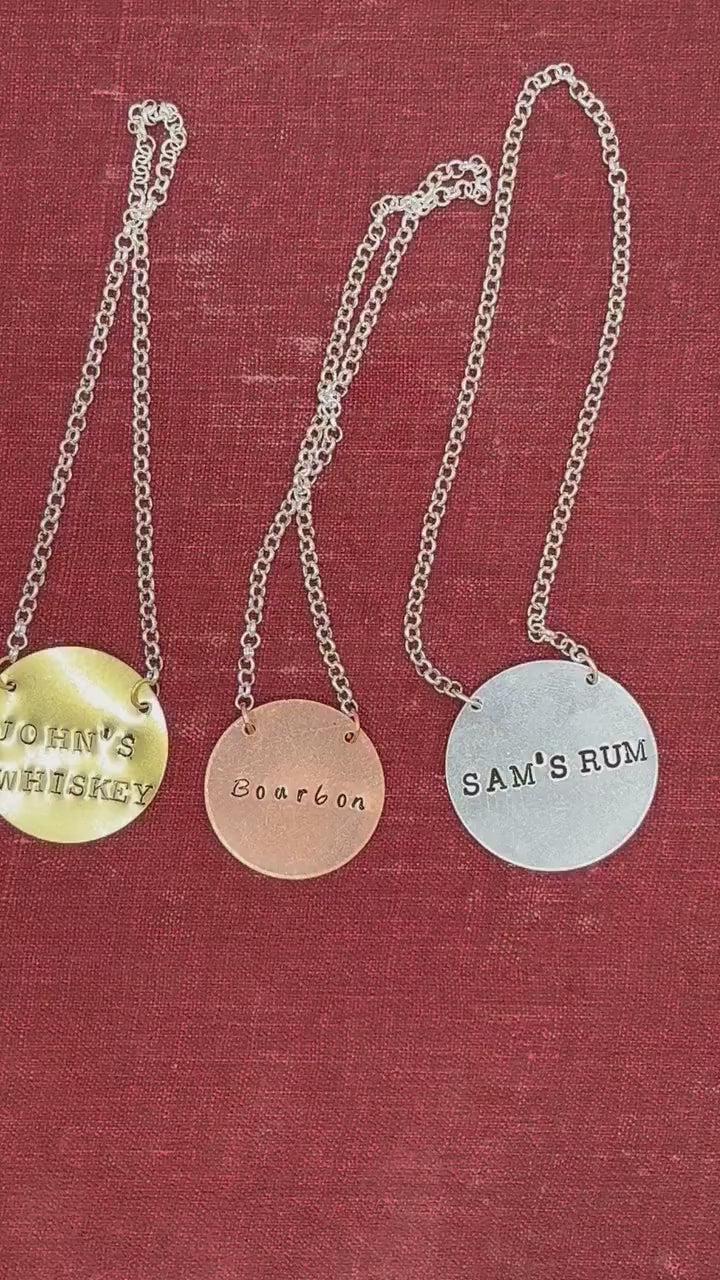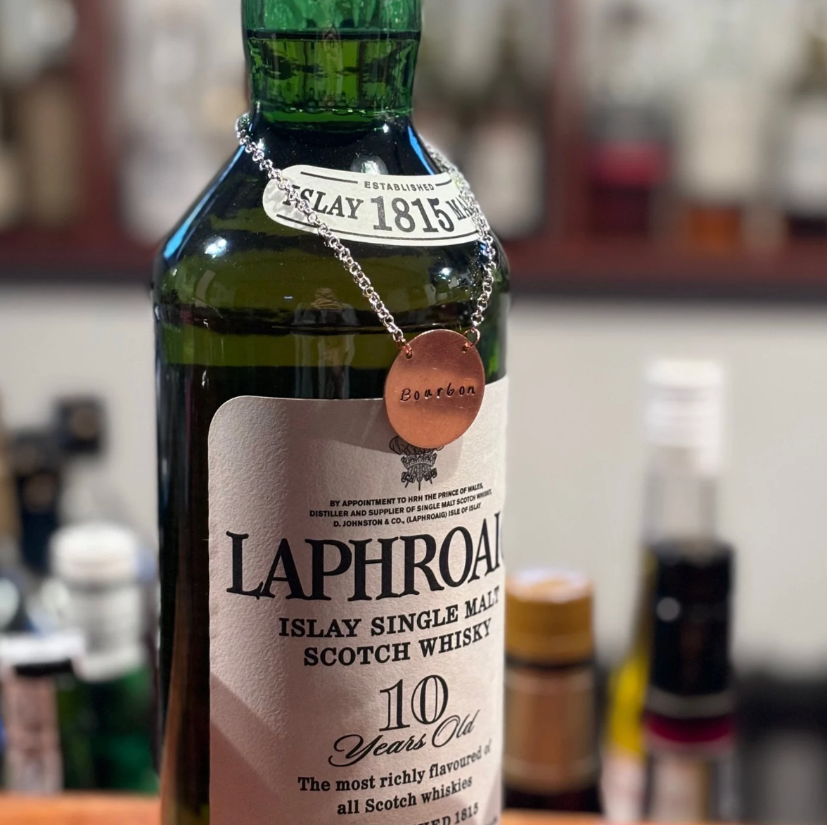 Dieses Bild zeigt beispielhaft das Etikett, das Sie erhalten werden. Es handelt sich um eine Handstempeltechnik, bei der jeder Buchstabe oder jedes Symbol von Hand eingehämmert wird (es werden keine Maschinen verwendet). Daher ist jedes Etikett ein Unikat.