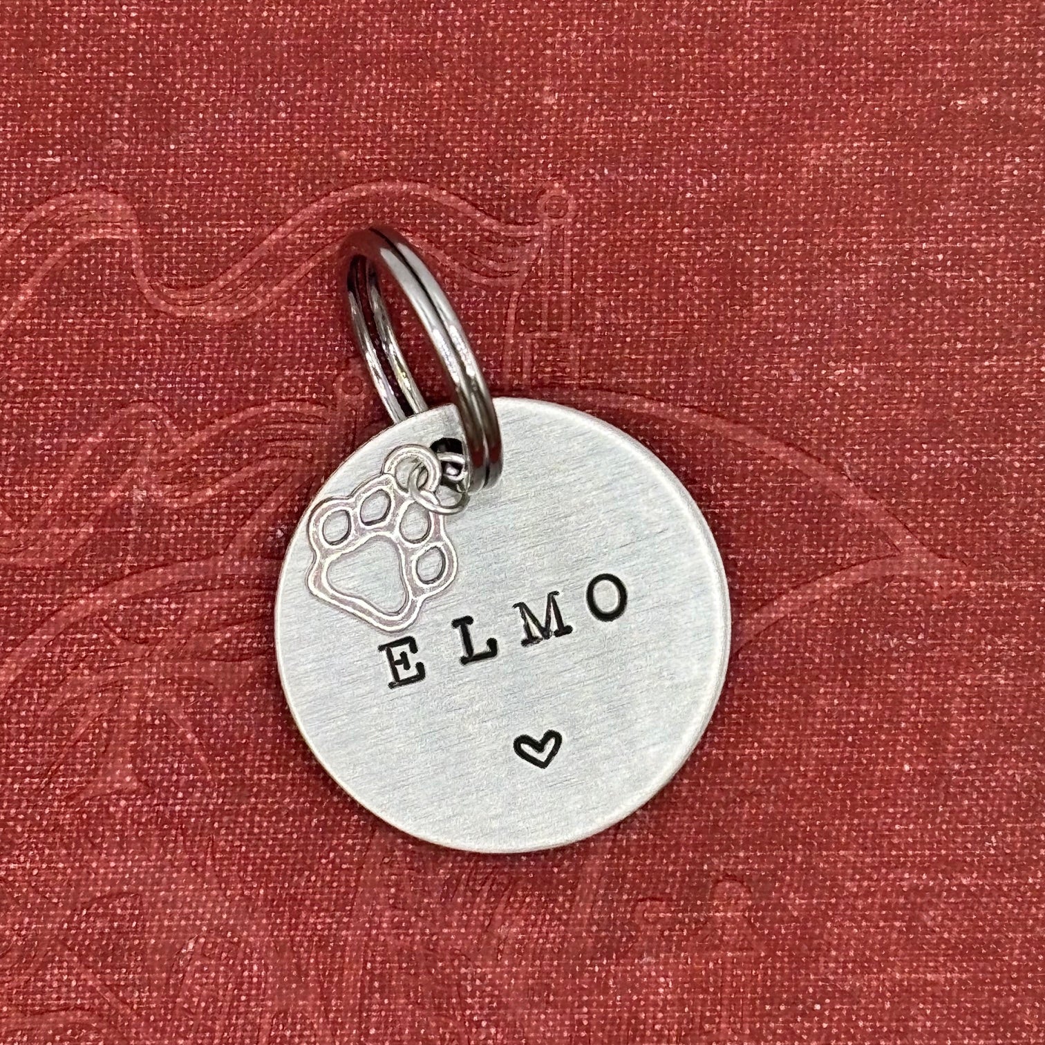Dog tag, double-sided, hand-stamped with a silver dog paw charm