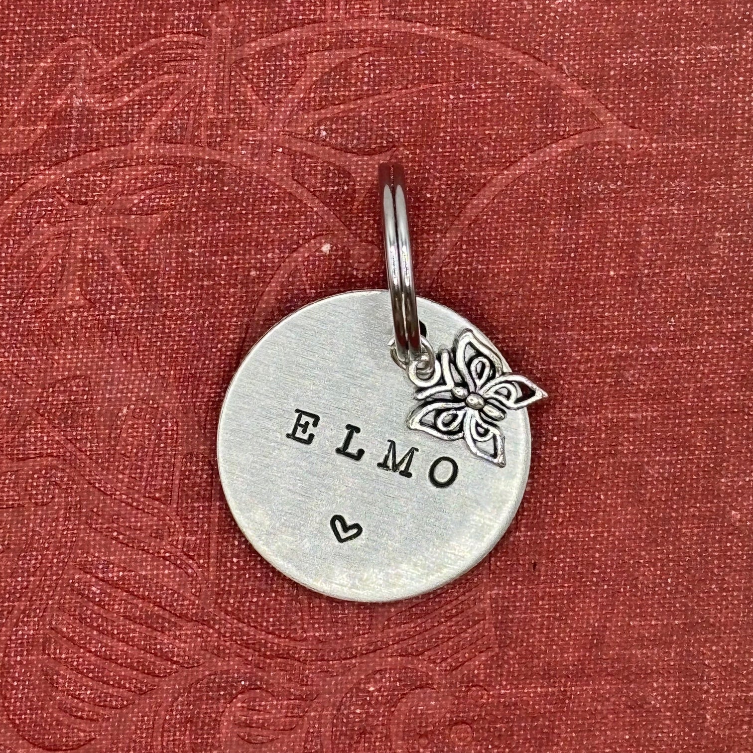 Dog tag, double-sided, hand-stamped with a silver butterfly charm