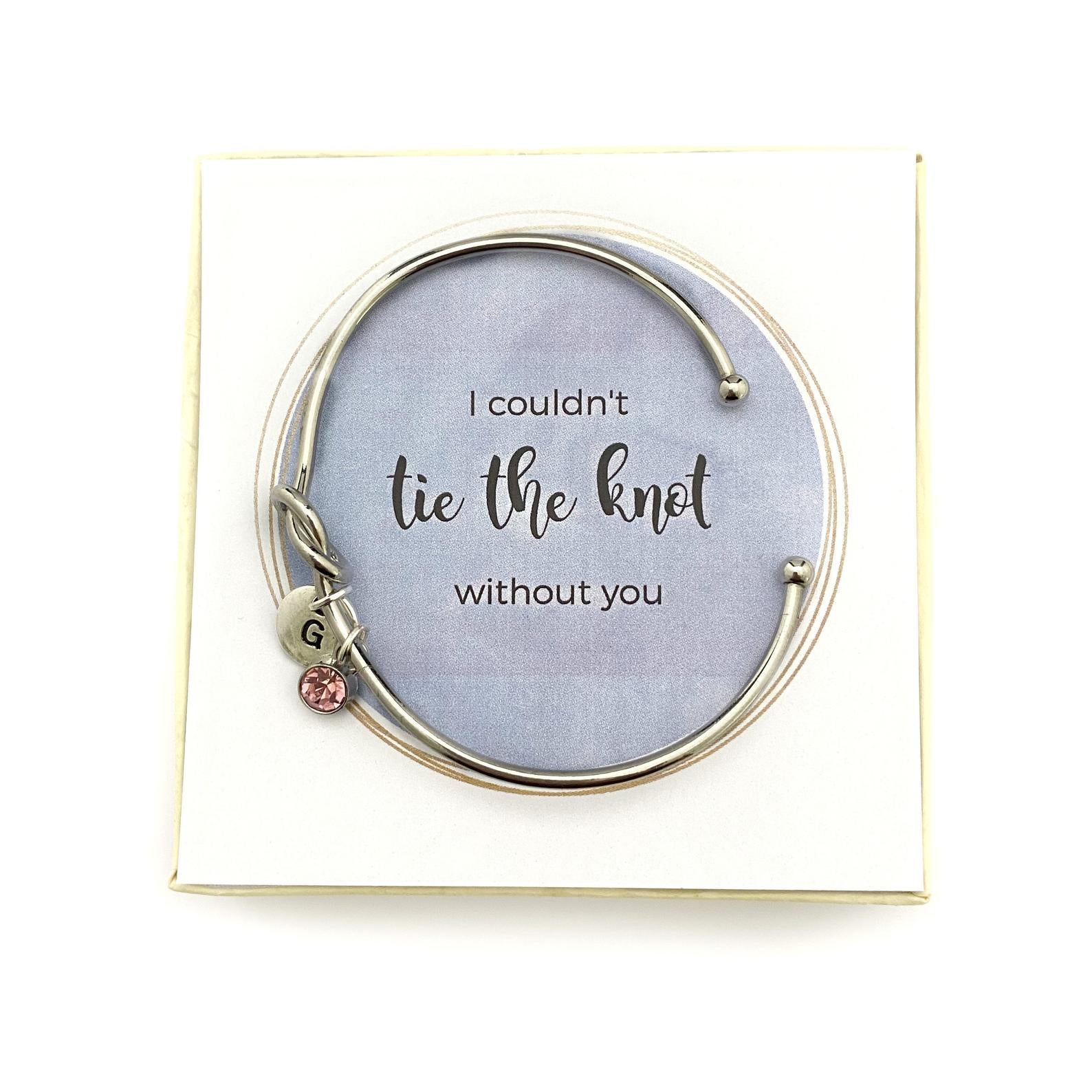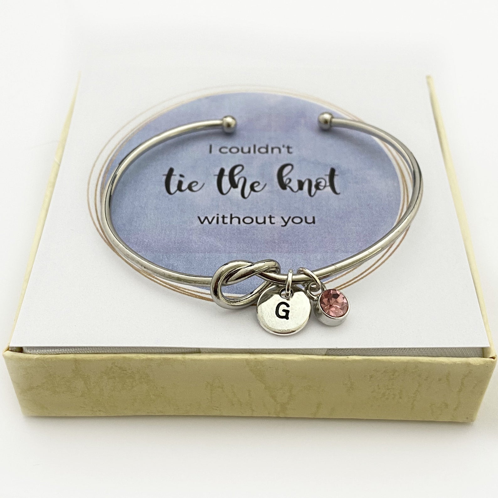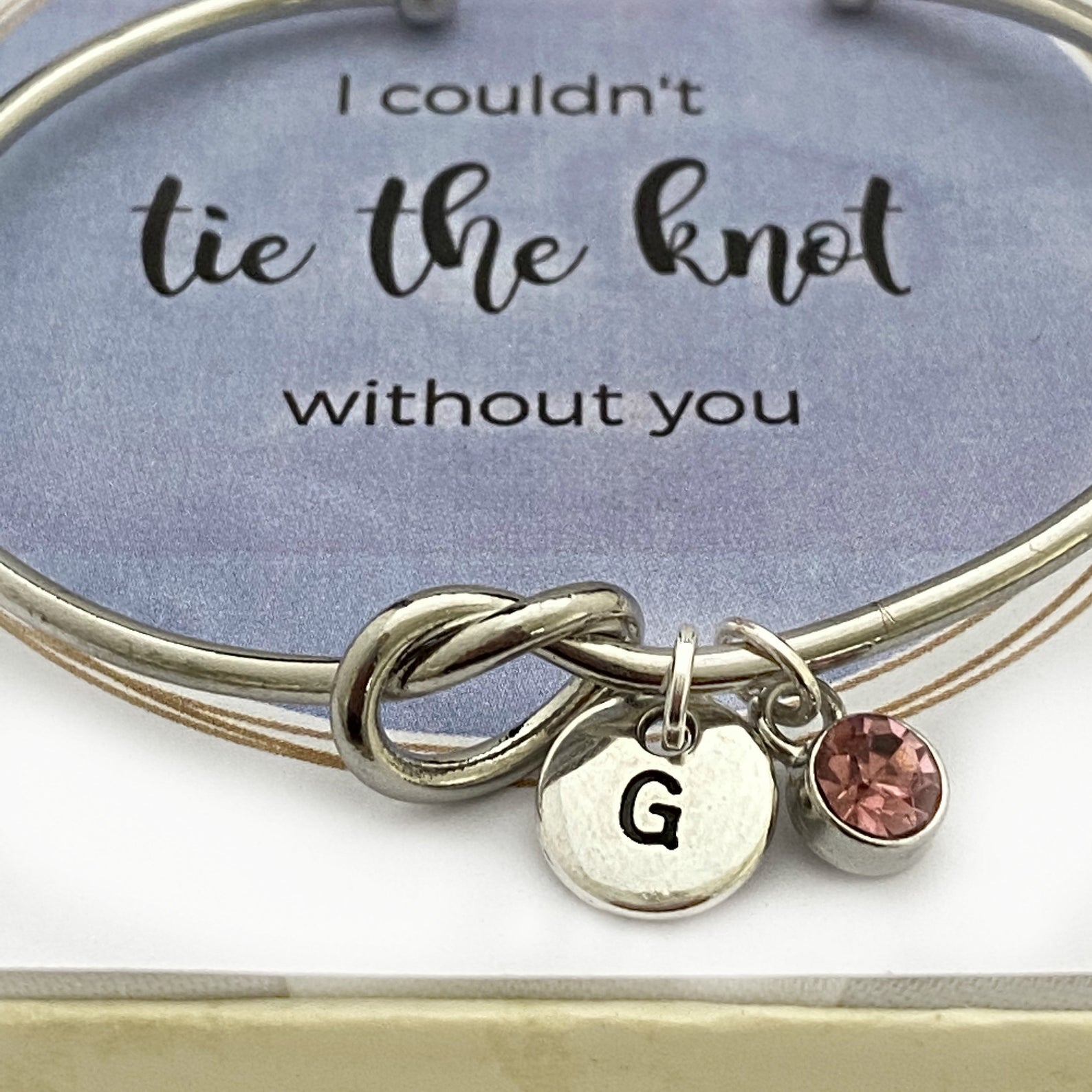 Knoop armbanden bruidsmeisjes, knoop armband met initiële charmes, knoop de knoop armband, gepersonaliseerde bruidsmeisje voorstel cadeau