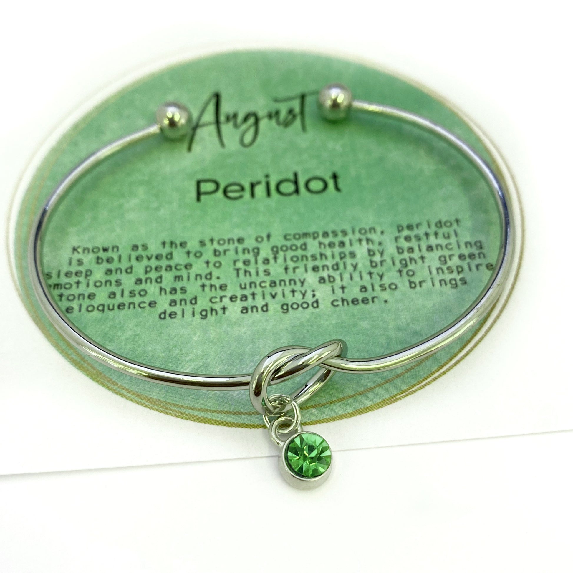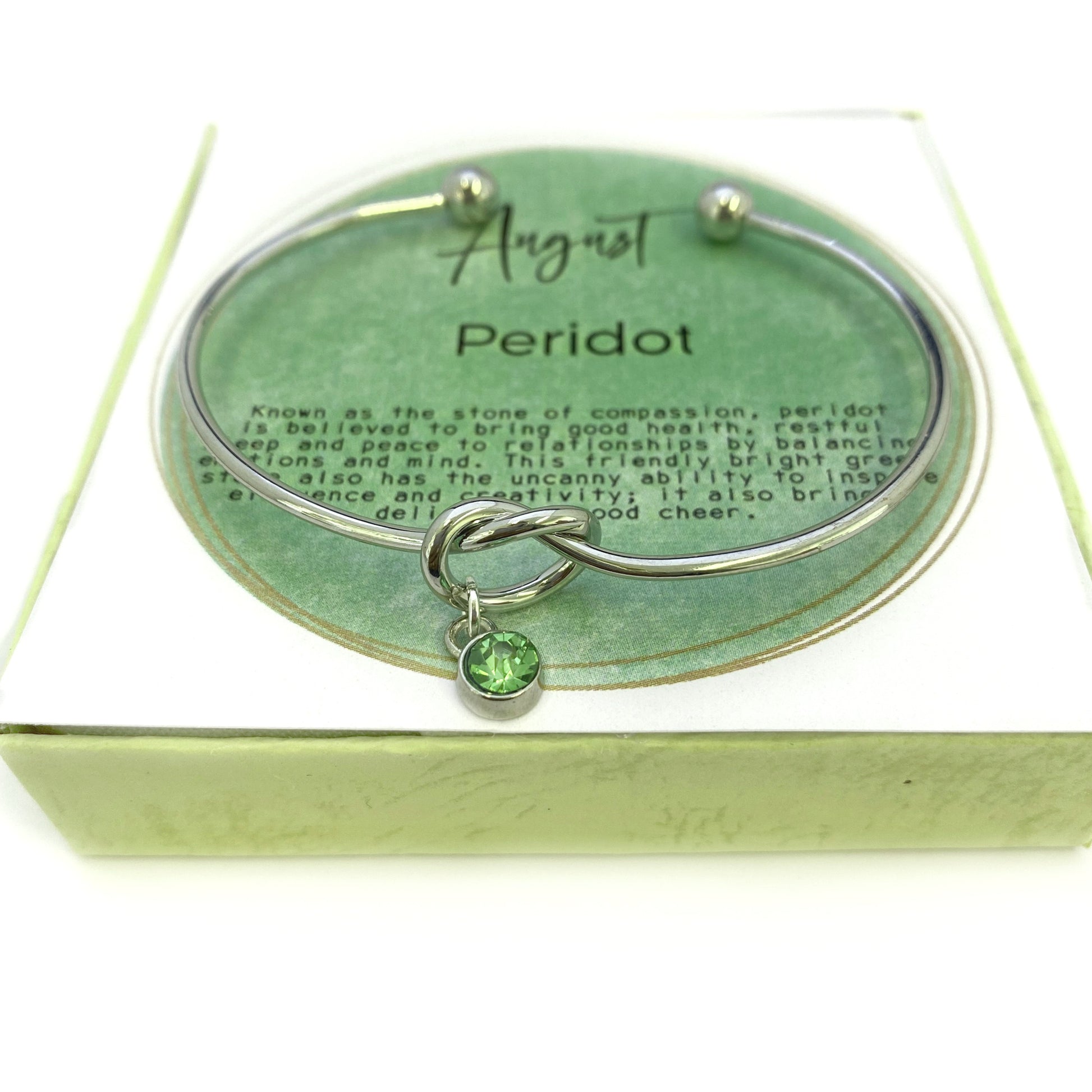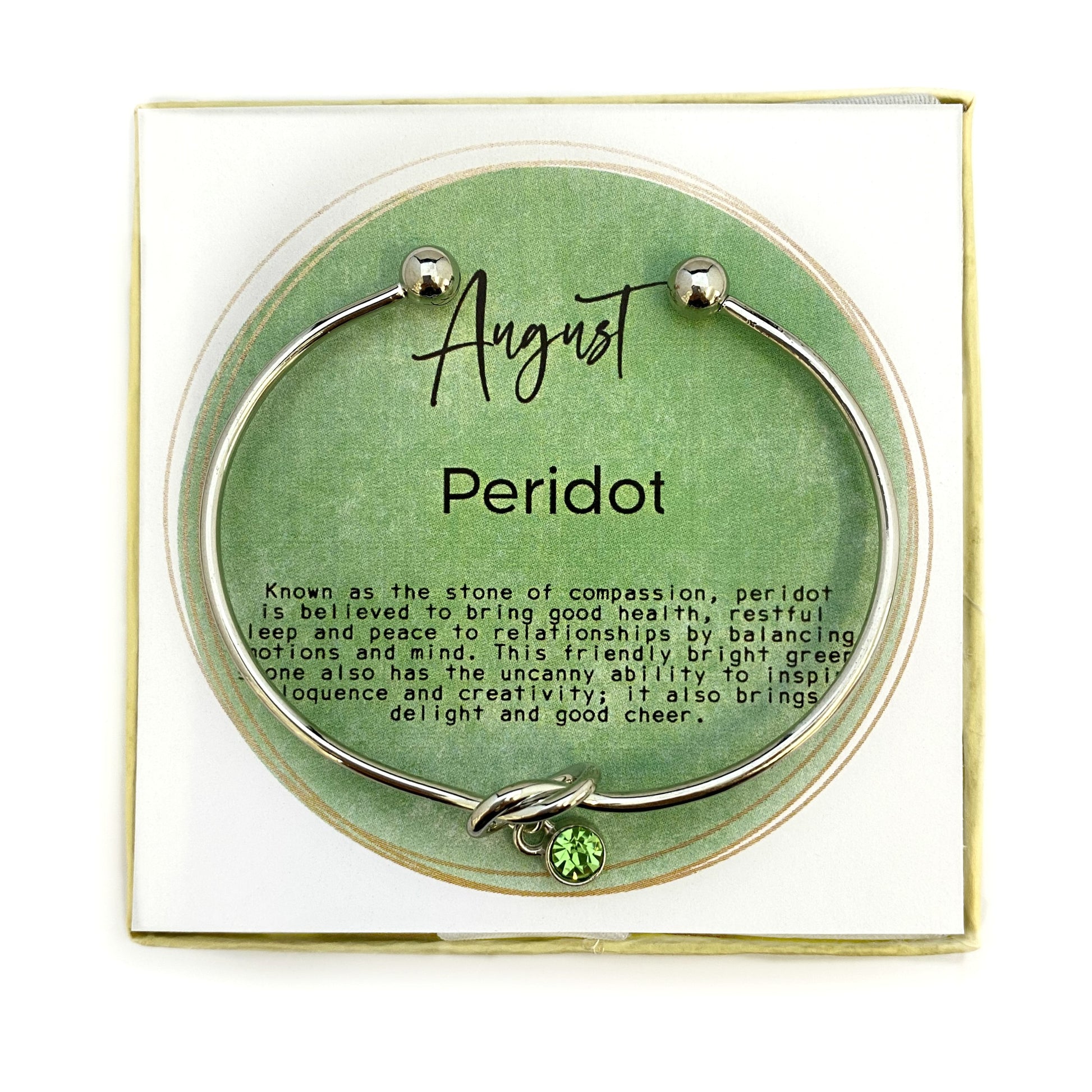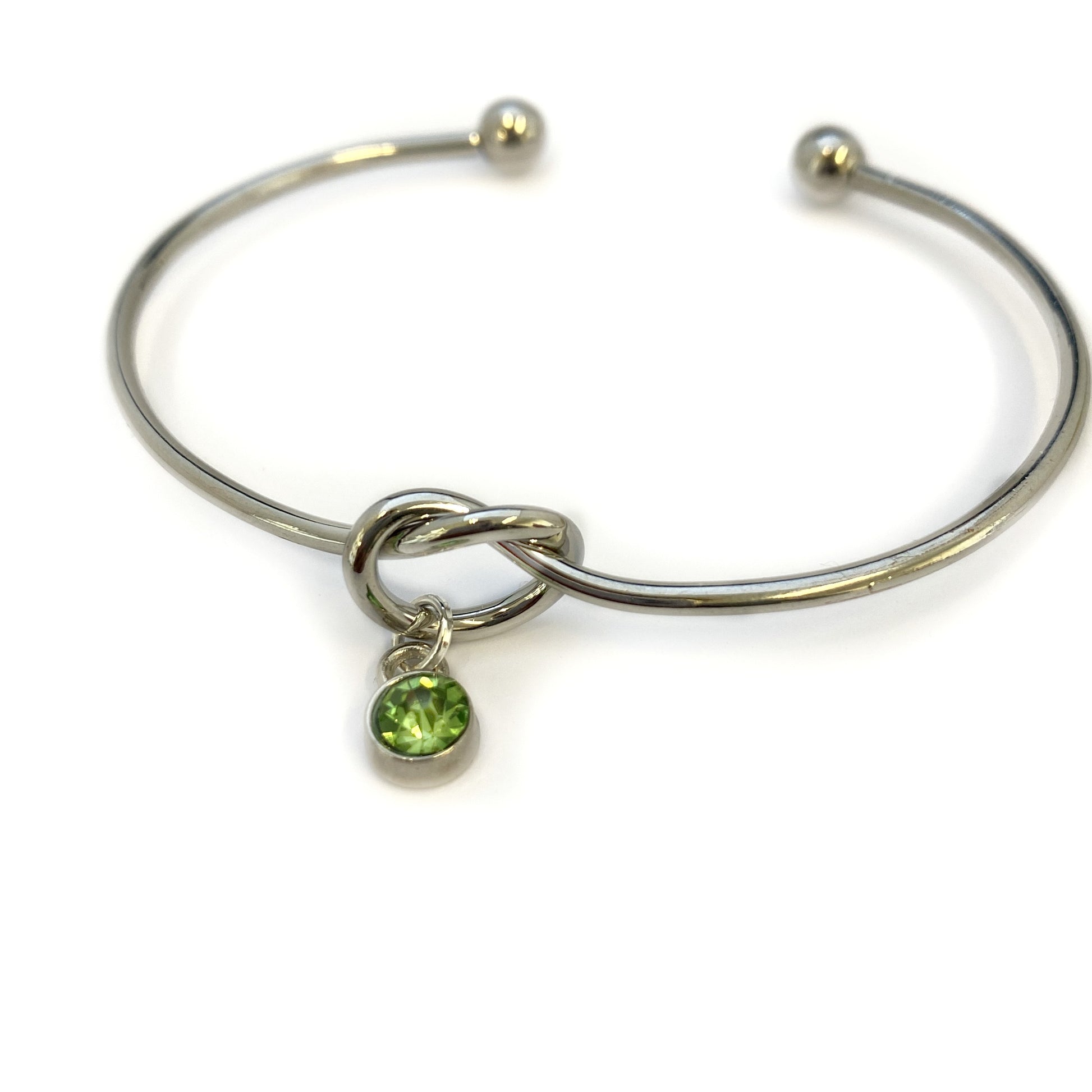 Birthstone KNOT Bracelet, Personalized Bridesmaid Gift, Tie the Knot Bracelet, August Birthstone charm Bracelet, Silver knot bangle cuff